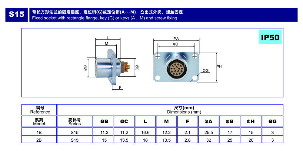 B系列S15带长方形法兰固定插座
